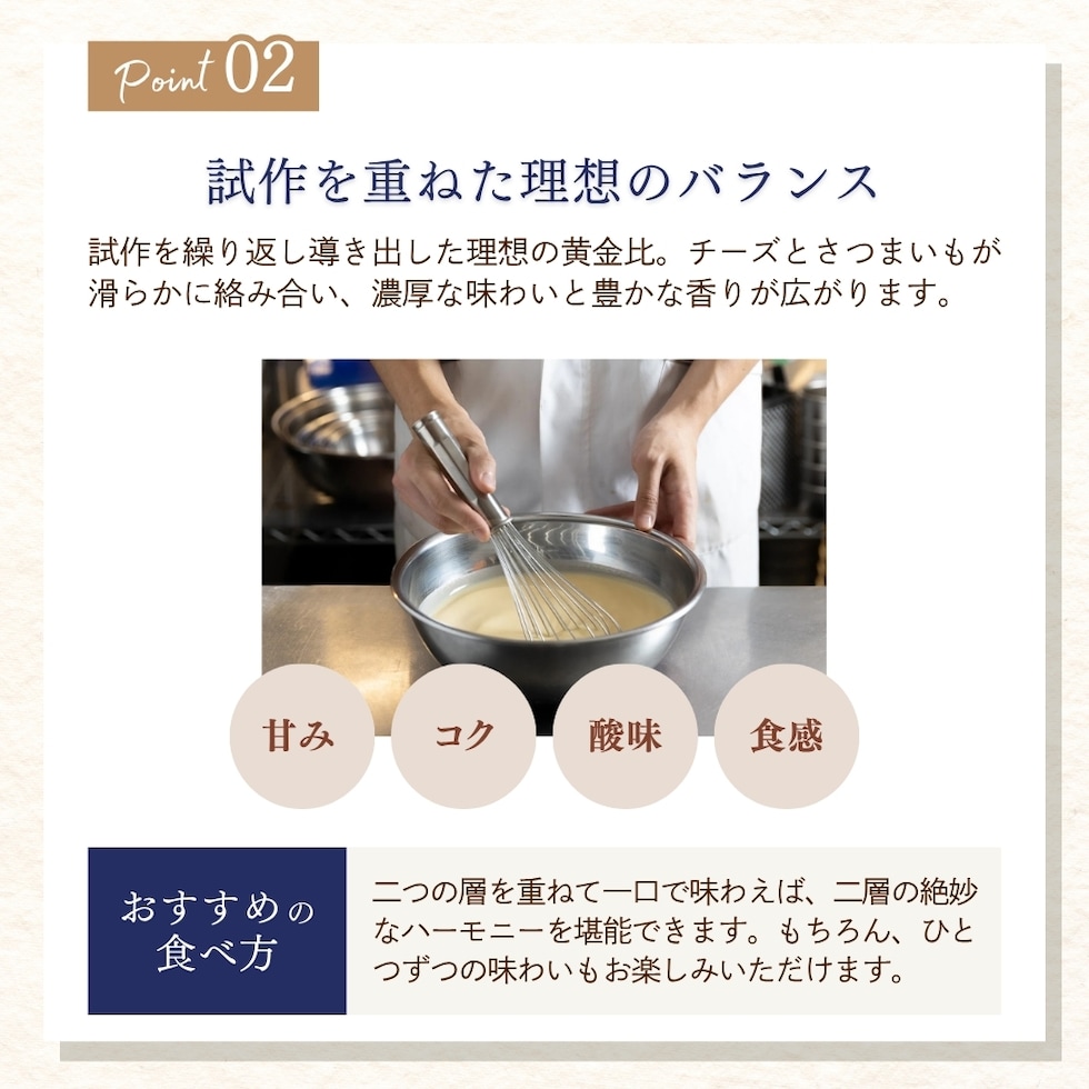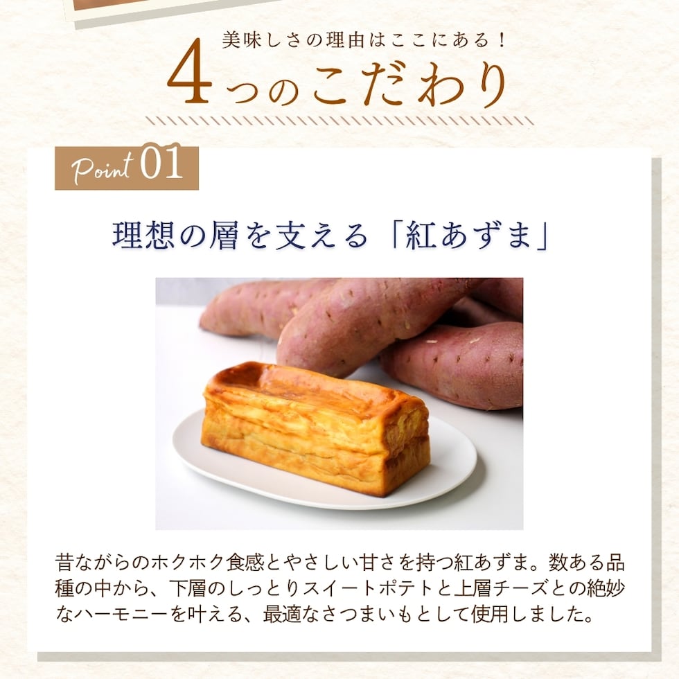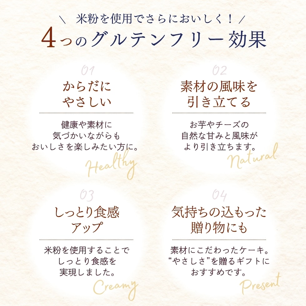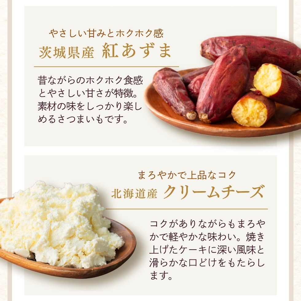 | 原材料名 | さつまいも、ナチュラルチーズ、クリーム、加糖卵黄、オリゴ糖シロップ、牛乳、全卵、無塩バター、米粉、砂糖加工品/香料 |