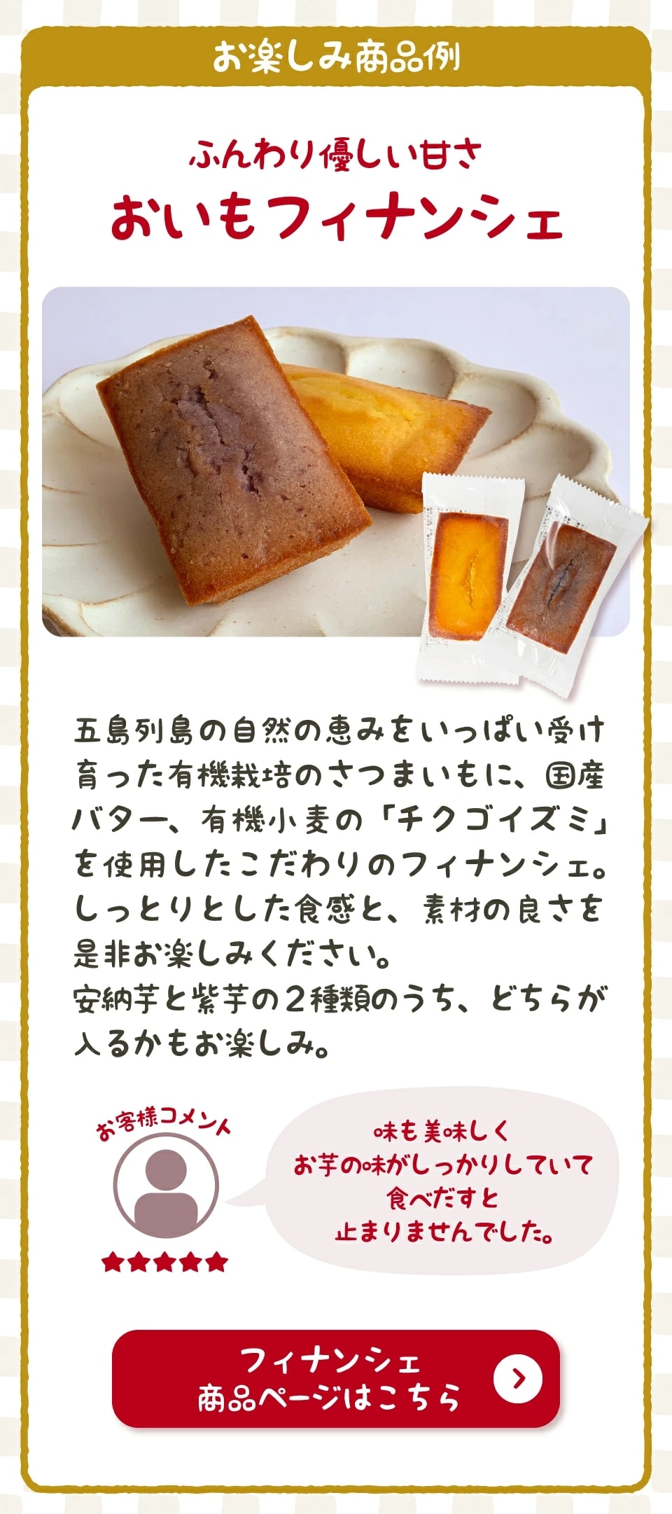 | 原材料名 | 有機安納芋(長崎県五島産)、バター(北海道産)、グラニュー糖、レモン果汁、(一部に乳成分を含む) |