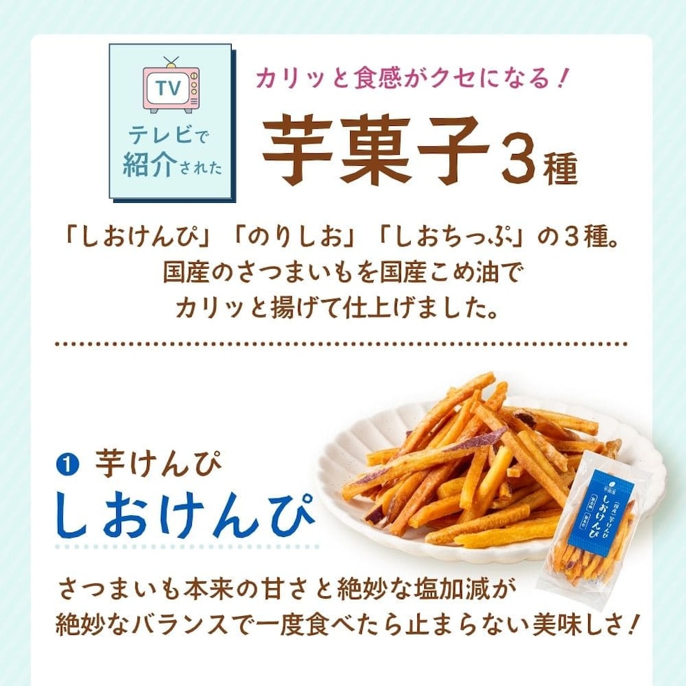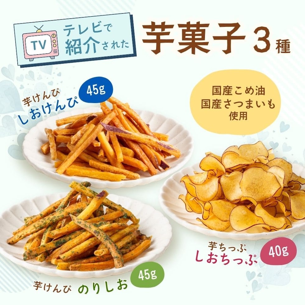 | 原材料名 | さつまいも(国産)、こめ油、砂糖、塩 ※青のり味のみ青のり使用 |