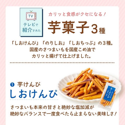 | 原材料名 | さつまいも(国産)、こめ油、砂糖、塩 ※青のり味のみ青のり使用 |
