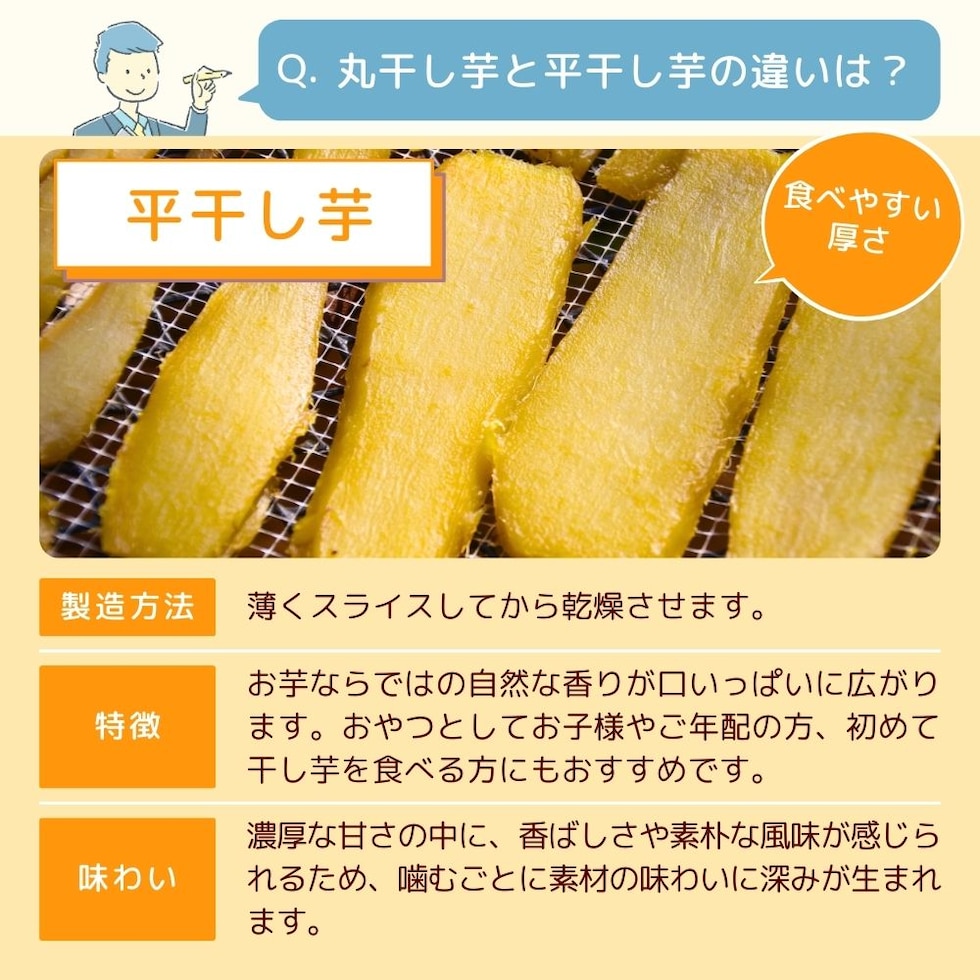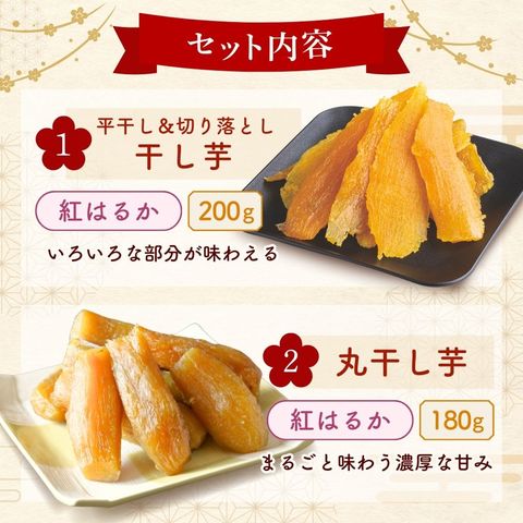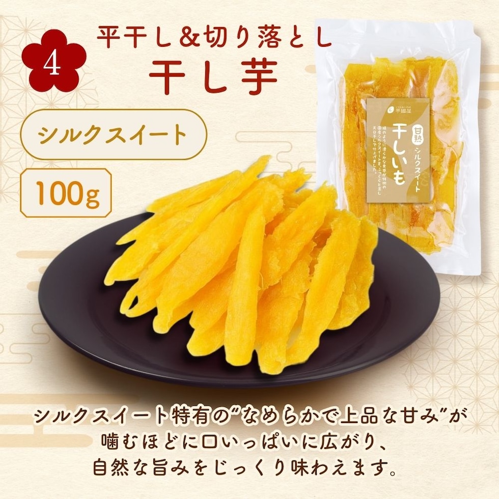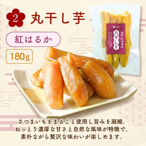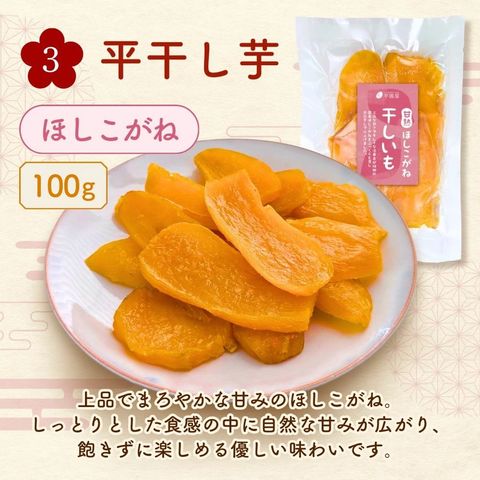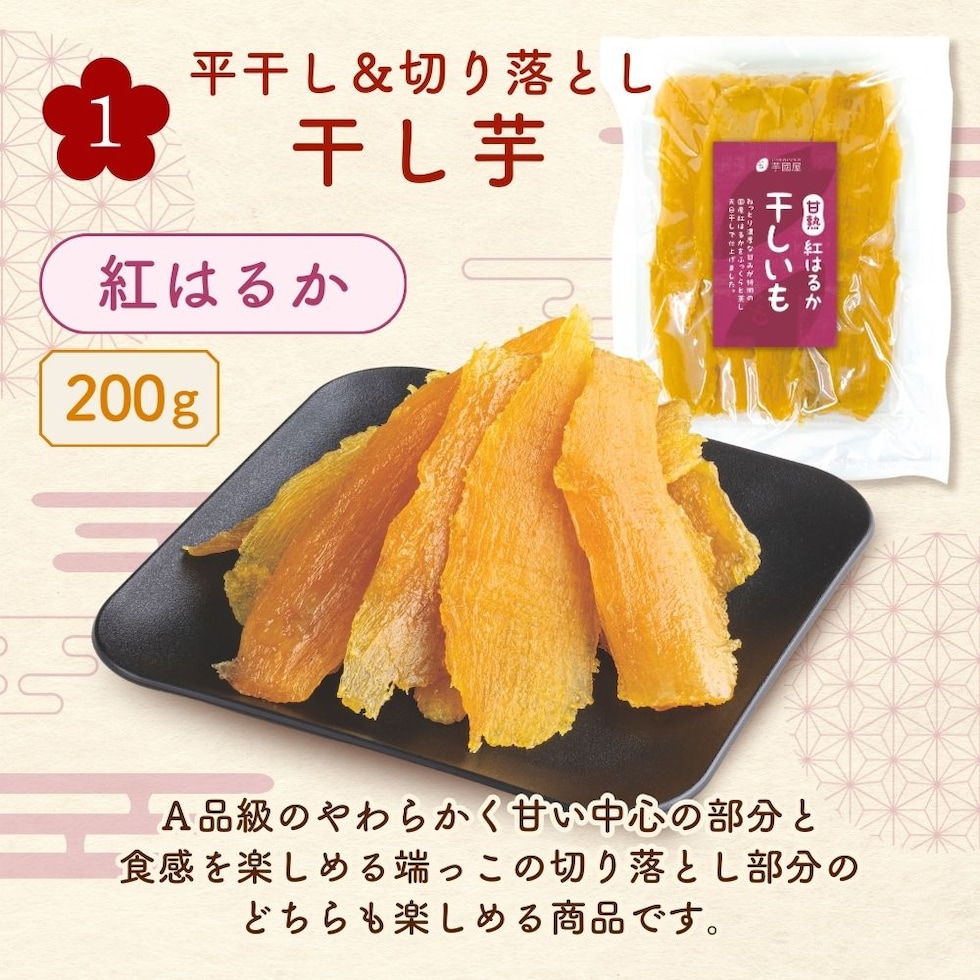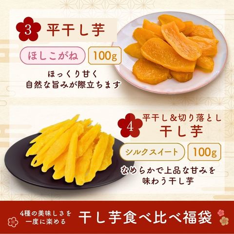 | 内容量 | (1)干し芋 (紅はるか)200g (2)丸干し芋 (紅はるか) 180g (3)干し芋 (ほしこがね) 100g (4)干し芋 (シルクスイート) 100g |