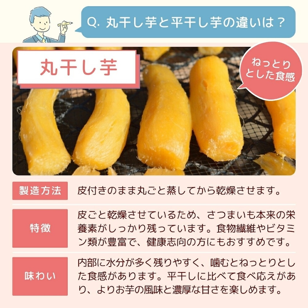 ■追跡番号付きメール便(ネコポス)にてお送りいたします。 宅急便と同様に発送から1~2日程度でお届けが可能です。 ※事前に投函口の大きさのご確認をお願い致します。 茨城県ひたちなか市でサツマイモの 生産から干し芋の加工まで行っております。 ねっとり柔らかいタイプの丸干し芋です。 歯がいらないほど柔らかいです。 ミネラル、食物繊維が豊富で筋トレ、ダイエット、美容、美肌に◎ 賞味期限にかかわらず到着後は早めにお召し上がりください。 小分けで保存し冷蔵庫で1ヵ月、冷凍庫で半年がお召し上がりの目安となります。 ※開封後はすぐに小分けやジップロックなどに入れることをお勧めします。 商品情報 名称 干し芋 原材料名 さつまいも(紅はるか) 原産地名 茨城県ひたちなか市 内容量 400g 賞味期限 お届け日より約30日間 保存方法 お受け取り後は必ず小分けにして冷蔵または冷凍してください。 加工者 株式会社 芋國屋 千葉県流山市駒木633-4