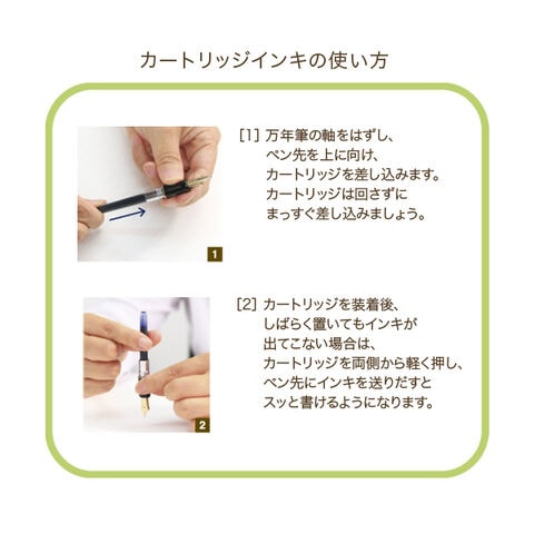 【カートリッジインキの使い方】1.万年筆の軸をはずし、ペン先を上に向け、カートリッジを差し込みます。カートリッジは回さずにまっすぐ差し込みましょう。