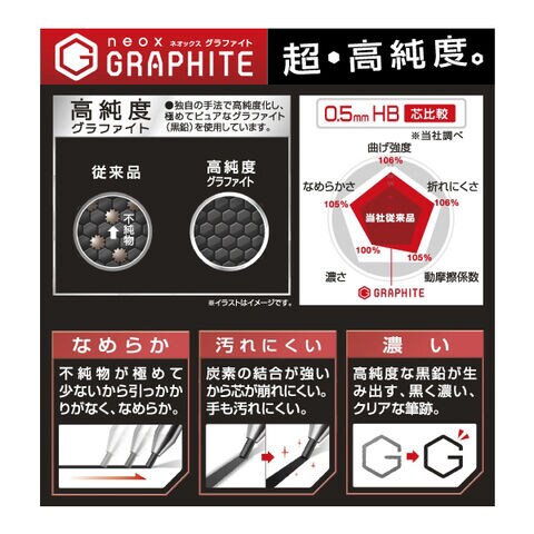 原料の黒鉛に、極めて不純物の少ない高純度黒鉛を使用。炭素原子同士の結合が強固になり、従来よりも強度がアップしました。また、黒鉛結晶の性質である高い潤滑性を十分活かすことができたため、さらになめらかに書けるようになりました。