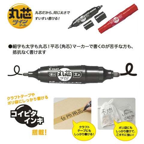 従来の油性ツインマーカーは細字=丸芯、太字=平芯(角芯)が一般的でした。