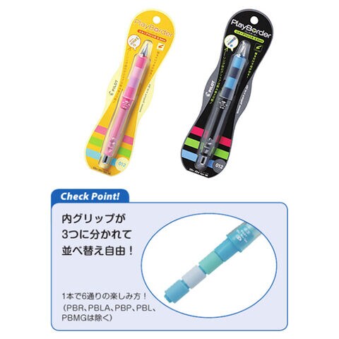 「ドクターグリップCLプレイボーダー」は、ボーダー柄の色によって3つに分かれている内グリップを組み替えたり、交換したりして、お気に入りの組合せを楽しめるシャープペンシルです。