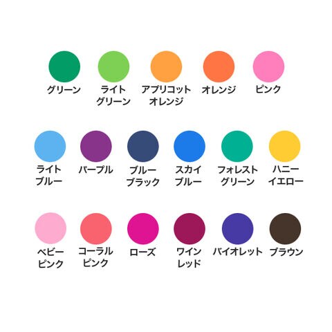色:全17色:G(グリーン)、LG(ライトグリーン)、AO(アプリコットオレンジ)、O(オレンジ)、LB(ライトブルー)、P(ピンク)、PU(パープル)、BB(ブルーブラック)、SKL(スカイブルー)、FG(フォレストグリーン)、HY(ハニーイエロー)、BP(ベビーピンク)、CP(コーラルピンク)、RS(ローズ)、WR(ワインレッド)、V(バイオレット)、BN(ブラウン)