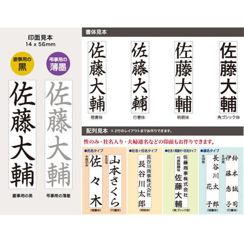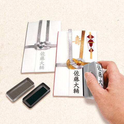 ・まっすぐに捺印しやすいスライドガイド付きで、ご祝儀やのし紙などへの表書きがカンタン・キレイにできます。姓のみ、夫婦連名、社名入りなどのゴム印面も作れます。