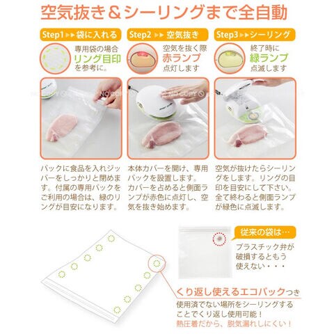 専用パック10枚付。その他、ジッパータイプの密封専用の袋であれば使用可能。(すべての種類に対応できるものではありません。)