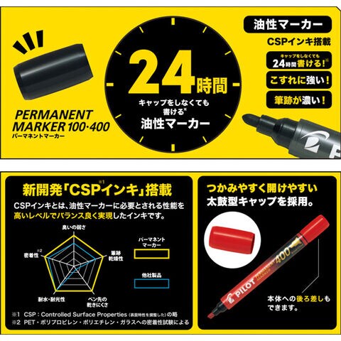 CSPインキとは、油性マーカーに必要とされる性能を高いレベルでバランス良く実現したインキです。