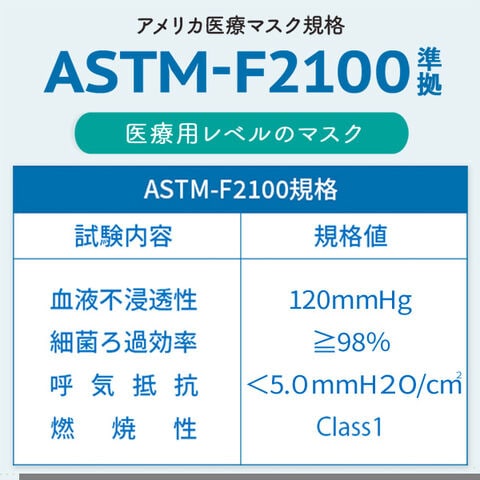 性能:VFE(ウイルス飛沫のろ過効率) 99%カット/BFE(細菌ろ過効率:3マイクロメートル) 99%カット/PFE(微粒子ろ過効率:0.1マイクロメートル) 99%カット 【ASTM-F2100規格 (医療用マスク米国規格)】 血液不浸透性:120mmHg 細菌ろ過効率:≧98% 呼気抵抗:<4.0mmH2O/cm2 燃焼性:Class1 ※ASTMとは、米国試験材料協会のことで、世界最大級の国際基準化規格制定機関です。