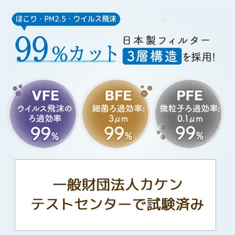 ・PFE(微粒子ろ過効率:0.1マイクロメートル) 99%カット