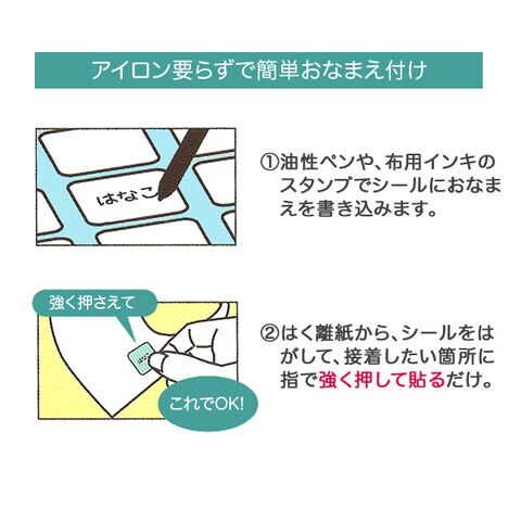 1.油性ペンや、布用インキのスタンプでシールにおなまえを書き込みます。