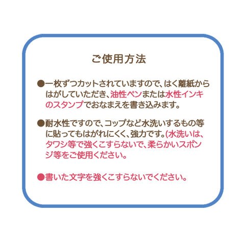 ・一枚ずつカットされていますので、はく離紙からはがしていただき、油性ペンまたは耐水インキのスタンプでおなまえを書き込みます。