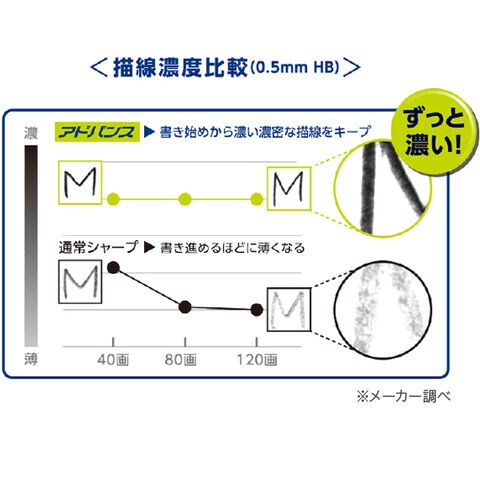 アドバンスは、書き進めても芯先が均一に摩耗してキレイな円すい形に保たれ、
