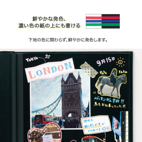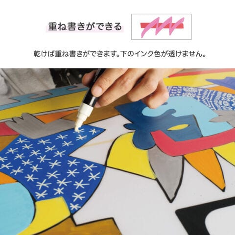 不透明インクなので、黒や濃色の上でも鮮やかに発色、重ね書きも可能。