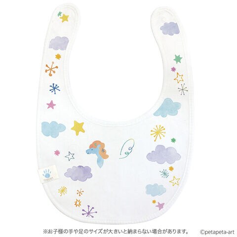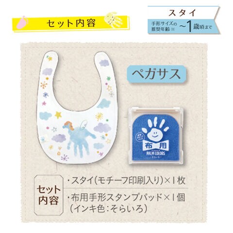スタイ(モチーフ印刷入り)×1枚、布用手形スタンプパッド×1個(インキ色:そらいろ)
