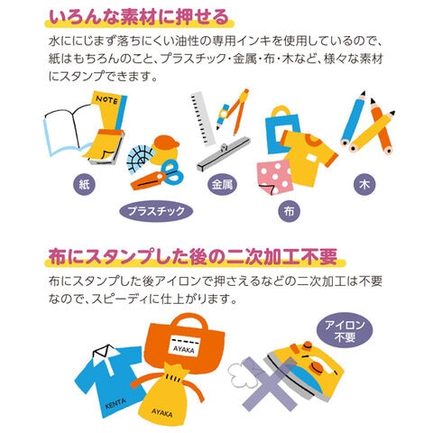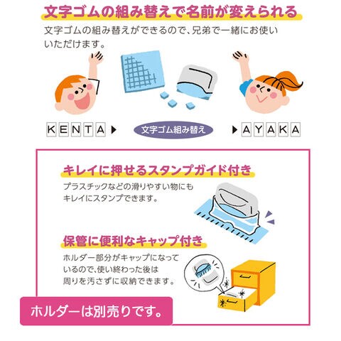 スタンプホルダーにゴムシートをセットするだけで、専用の名前スタンプがつくれます。