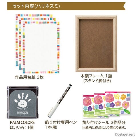 手形スタンプパッド(PALM COLORS)1色、木製フレーム1面、作品用台紙3枚、飾り付けシール3作品分、飾り付け専用ペン1本(黒)
