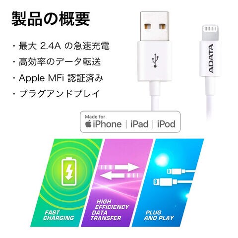 ・急速充電と高速データ転送画可能な Apple MFi 認証済みの Lightning コネクタ