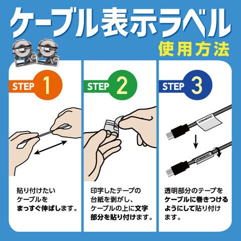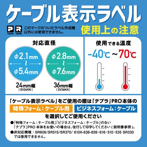 ・テプラ本体の「特殊フォーム:ケーブル用」「ビジネスフォーム:ケーブル」をご使用ください。特殊フォームがない機種は、印字行や文字サイズを変更してください。また、一部機種では使用できません(純正同等)。お使いの機種をご確認の上、ご購入ください。