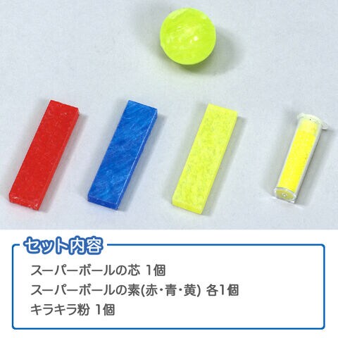 セット内容:スーパーボールの芯×1、スーパーボールの素(赤)×1、スーパーボールの素(青)×1、スーパーボールの素(黄)×1、キラキラ粉×1