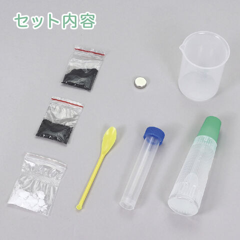 セット内容:砂鉄(10g)×2、ネオジム磁石×1、水のり(PVAのり)×1、15ml試験管×1、100mlビーカー×1、薬さじ×1、ホウ砂(2g)×1