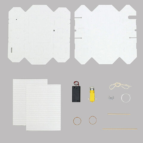 片面段ボール×2、竹ひご(長)×1、竹ひご(短)×1、接続パーツ×1、わゴム×2、レース用紙×1、糸×1、モーター×1、電池ボックス×1、テグス×1、台紙セット×1