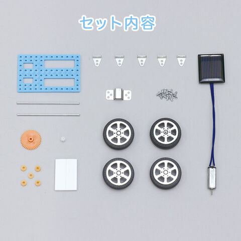 太陽電池シール×1、金具A×5(1つは予備)、金具B×1、ねじ×12(2つは予備)、タイヤ×4、太陽電池付モーター