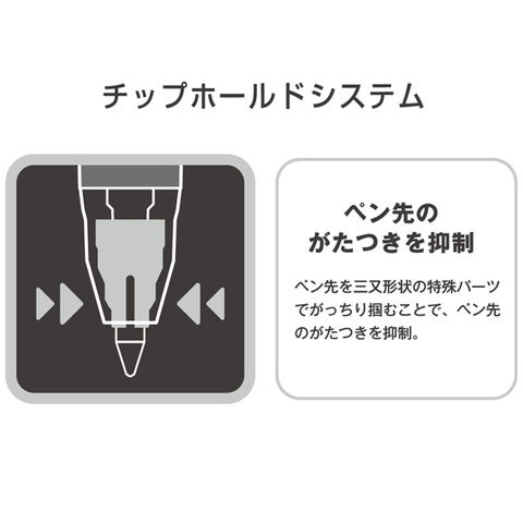ペン先を三叉形状の特殊パーツでがっちり掴むことで、ペン先のがたつきを抑制
