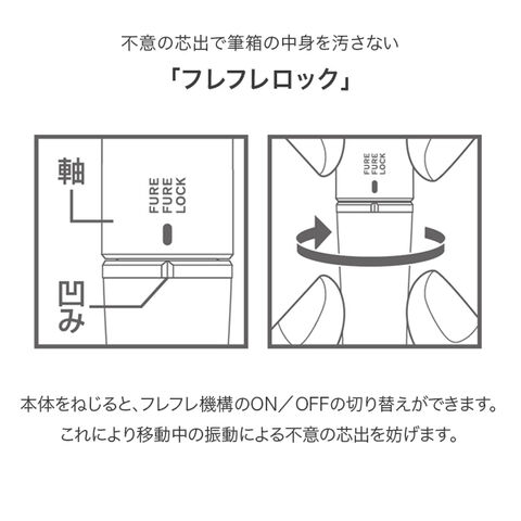 移動中の衝撃などで、フレフレ機構により芯が出てしまうことを防止する「フレフレロック」機構です。