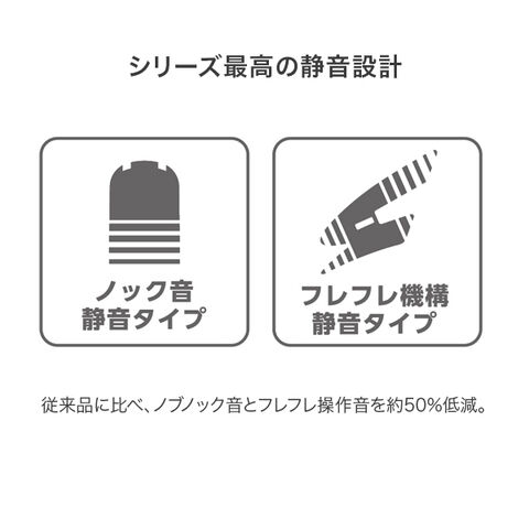 従来品と比べ、芯の繰り出しにおけるノック音とフレフレ操作音をそれぞれ約50%低減した静音設計です。