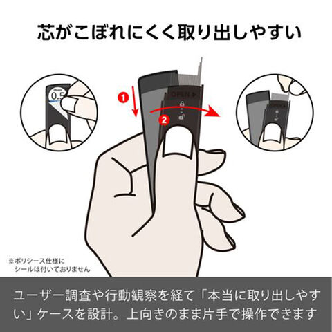 ケースを上向きのまま操作できるから、芯をこぼすリスクを減らせます。