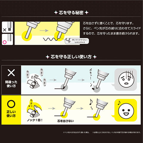 1回のノックで長く書き続けられ、さらに芯が折れる心配も無いため、書くことにとことん集中できます。