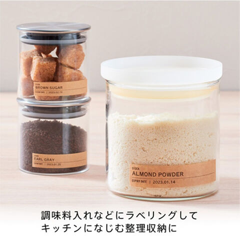 調味料入れや粉類の瓶などにラベリングすれば、キッチンにもなじむナチュラルな雰囲気の収納になります。