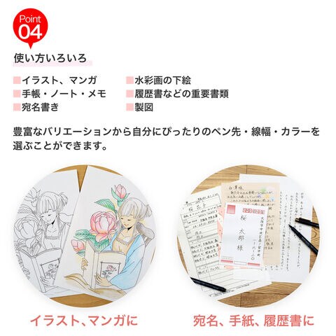 イラスト、製図、手帳への記入など、用途に合わせてペン先・線幅・カラーを選ぶことができます。