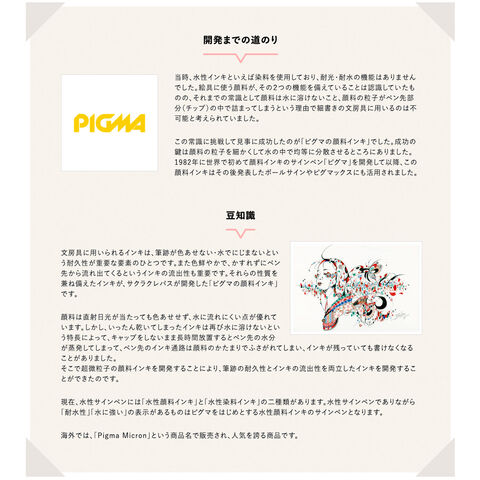 1982年にサクラクレパスがピグマの顔料インクを開発したことで、水性でありながら、耐水性・耐光性を実現することができました。