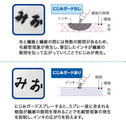 スプレー液に含まれる樹脂が繊維の隙間を埋めることでインキのにじみを抑えます。