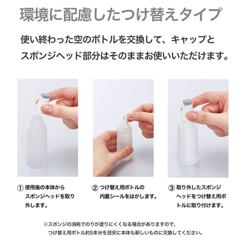 四角いスポンジヘッドで、ボトル部分のみをつけ替えることで、簡単に補充できるようになりました。
