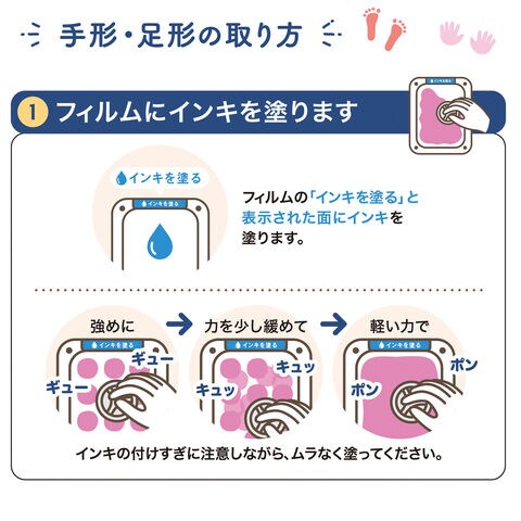 フィルムの下側にインキを塗って、上から手足を押す新感覚手形・足形キット!