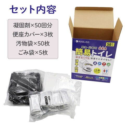 セット内容:凝固剤50個 汚物袋50枚 ゴミ袋5枚 便座カバー3枚