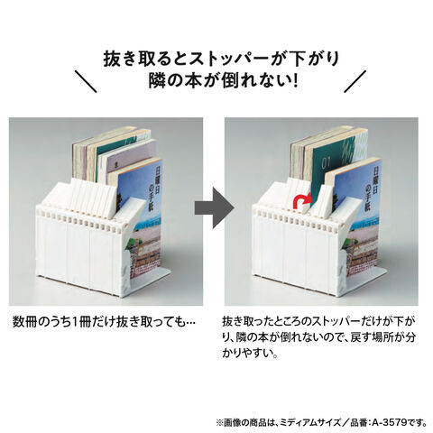 ・抜き取るとストッパーが下がり隣の本が倒れない!