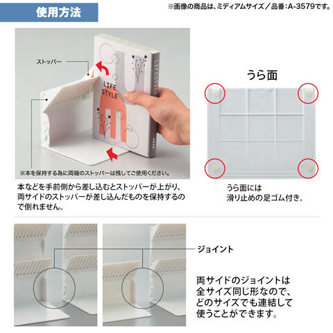 ●文庫サイズ:約105×148mm ●新書サイズ:約103×182mm ●A5(ハードカバー)サイズ:約156×217mm ●A-3580(A4 Medium)、A-3577(A4)の場合はA4縦サイズ程度まで ●CD:約143×125mm ●DVD:約136×191mm ※最小対応高さ:120mm(120mm以下はストッパーが十分に当たらないためスタンドできません) ※ストッパーの厚み(8.6mm)より薄いものなど、立てかけるものの厚みによって、直立しない場合があります。