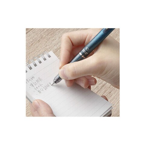 紙面に対し、垂直に強い筆圧が加わると、軸に内蔵されたスプリングが芯を上方向に逃し折れを防ぎます。