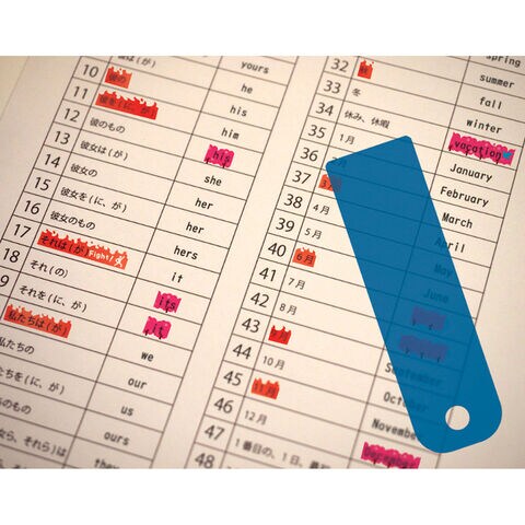 ノートや教材の覚えたい文字の上に引いて、暗記用赤シートを重ねて隠して覚える