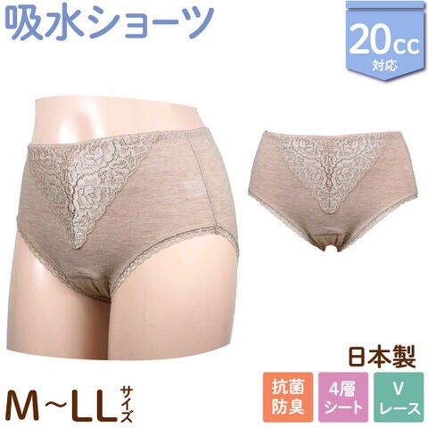 日本製 20cc 吸水ショーツ 綿混素材Vレース 婦人用 女性用 シニア 軽失禁 サニタリー 下着 Lサイズ