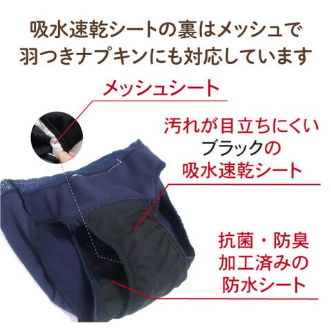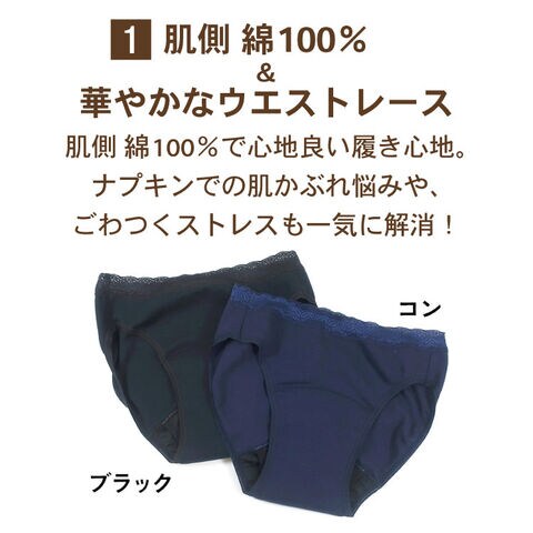 ・防臭・抗菌加工で菌の繁殖を抑え、経血の臭いも気になりにくく、洗濯も簡単なのでいつも衛生的です。