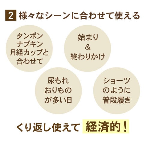 ・タンポン・ナプキン・月経カップと併用可能始まりそうな日、終わりかけの日など、シーンに合った履き方ができます。