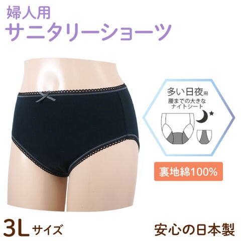 日本製 サニタリーショーツ 婦人用 肌に触れる内側 綿100% 多い日夜用 生理用 吸水 ナプキン ブラック 3Lサイズ