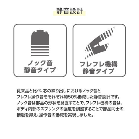 従来品と比べ、芯の繰り出しにおけるノック音とフレフレ操作音をそれぞれ約50%低減した静音設計です。